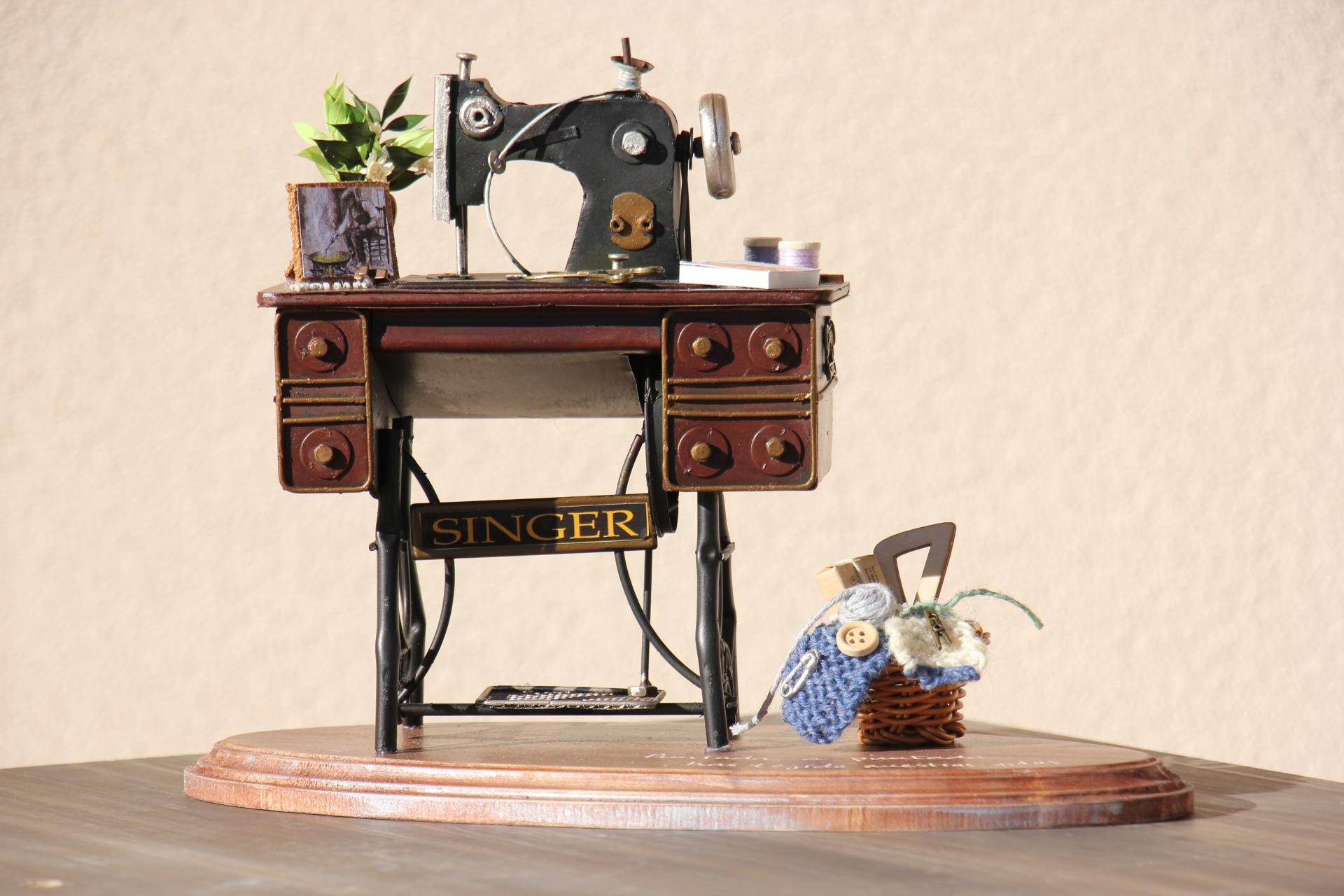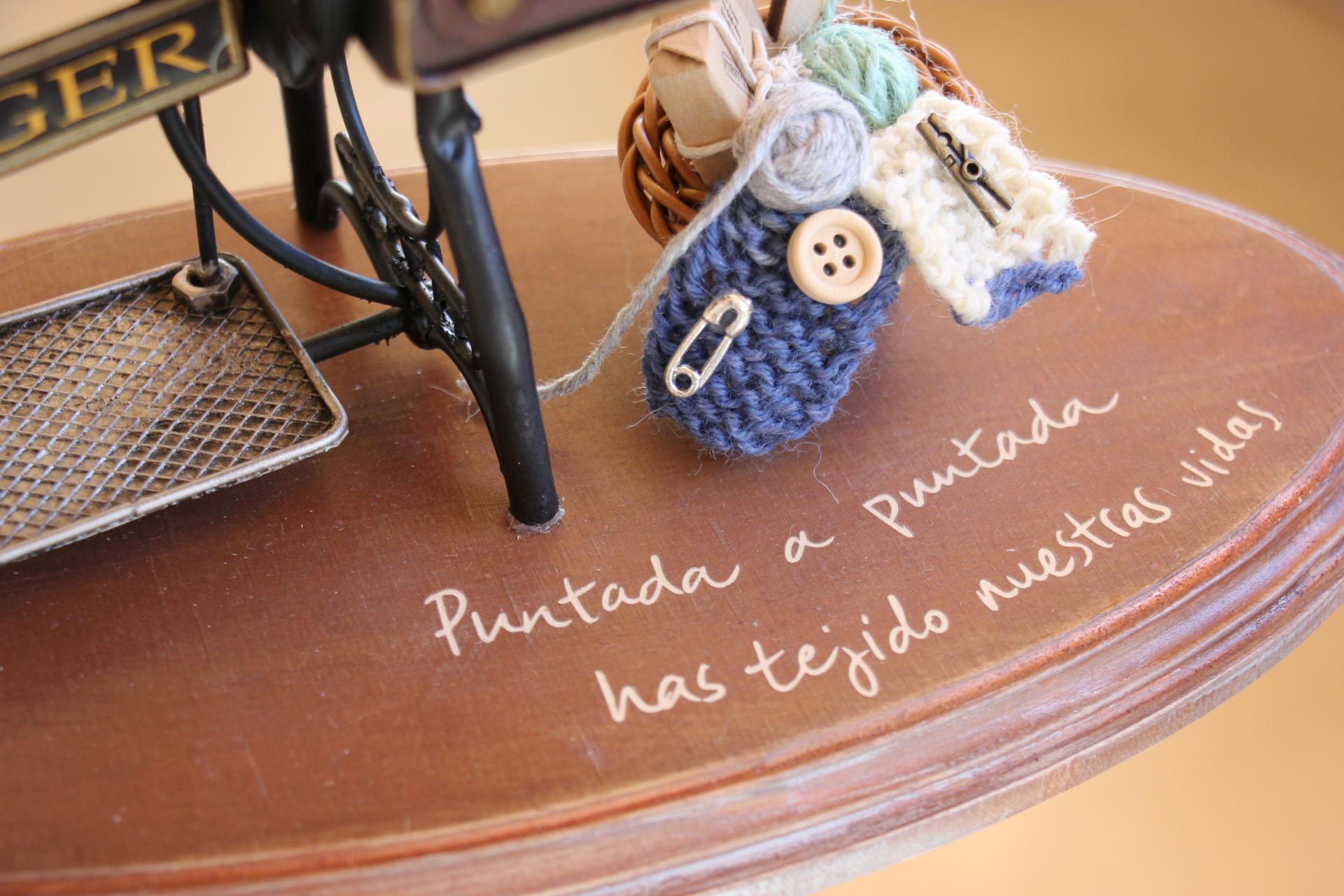 Máquina de coser colocada sobre una base de madera que lleva grabada la frase: 'Puntada a puntada has tejido nuestras vidas'.