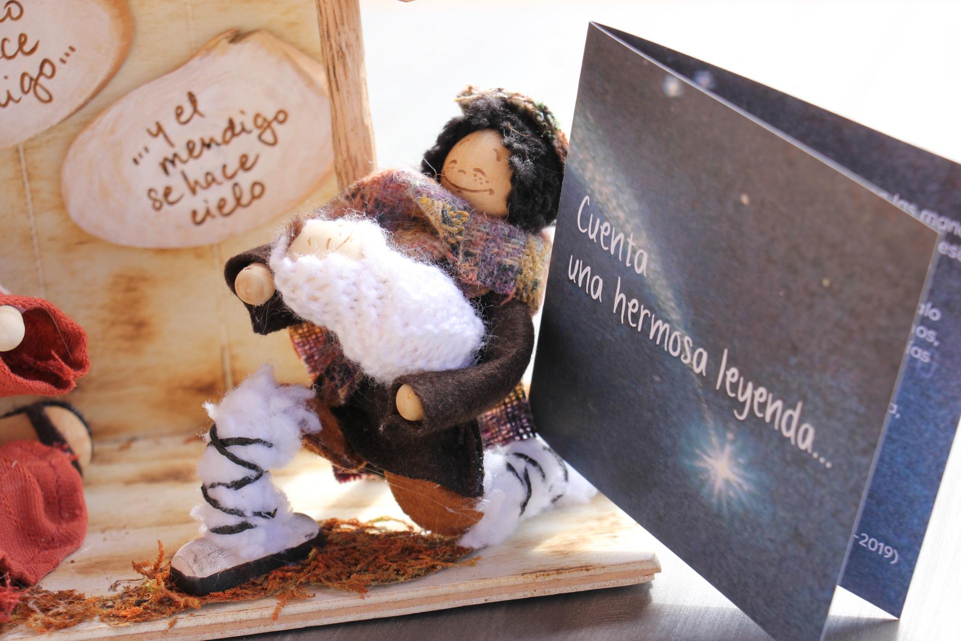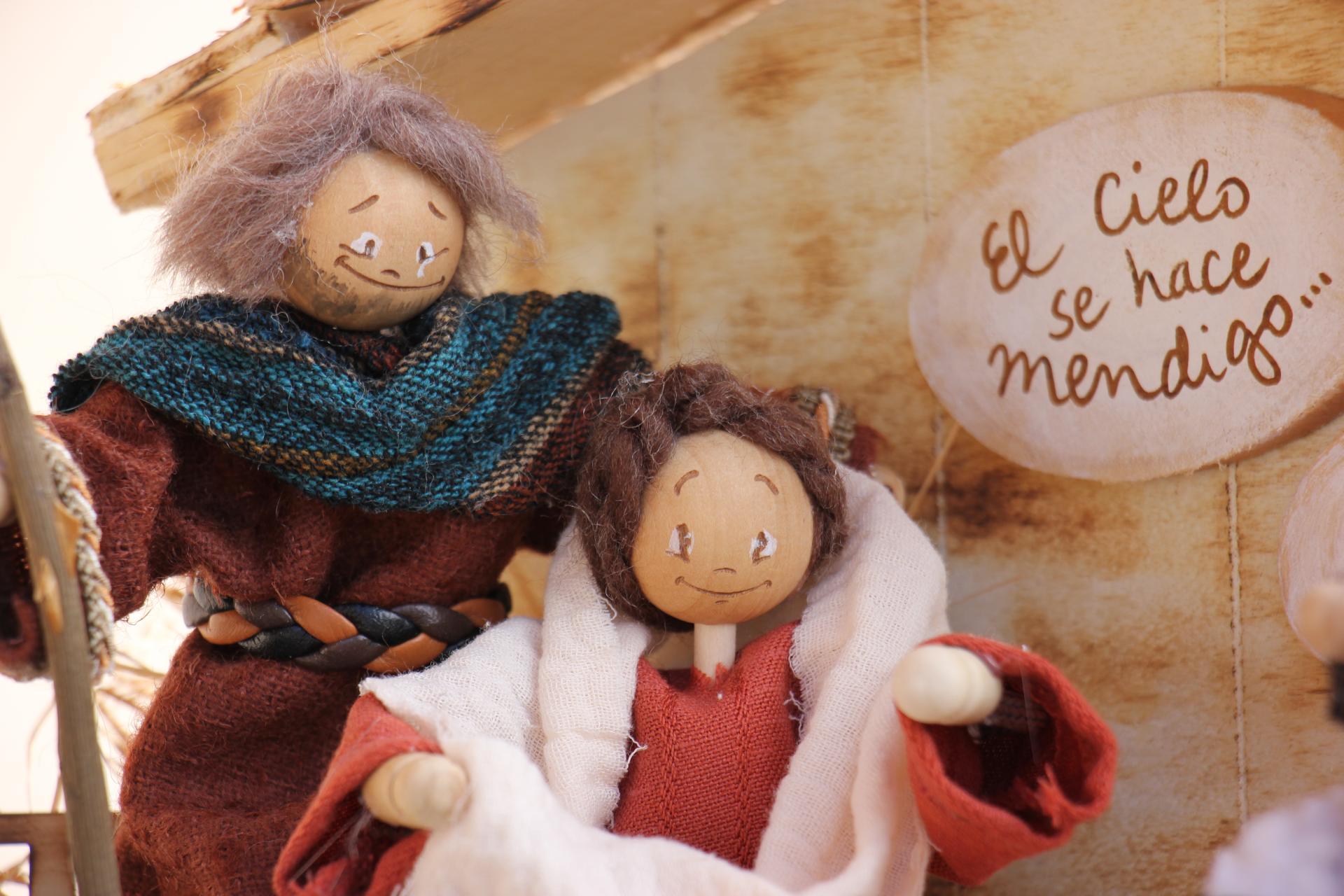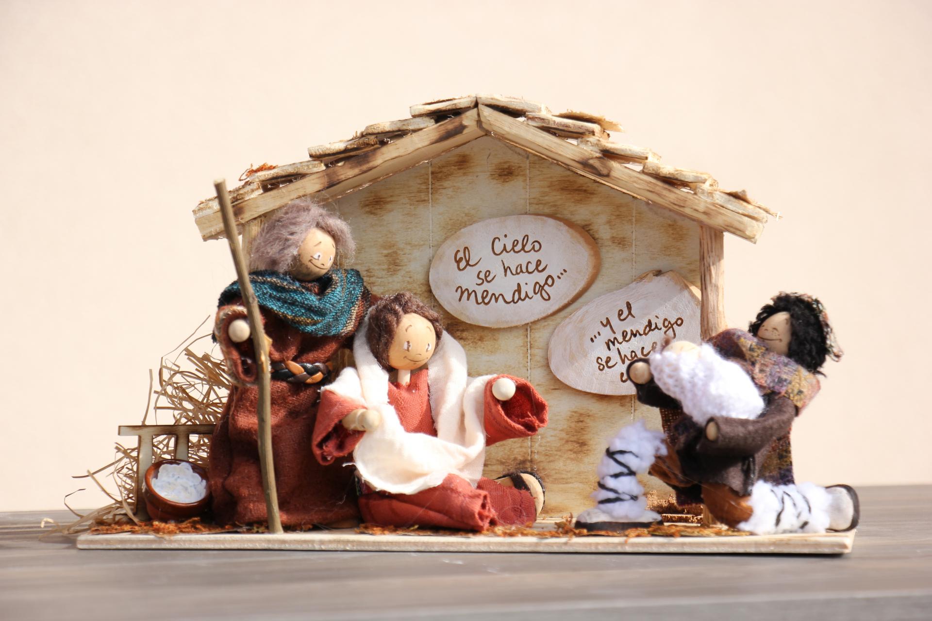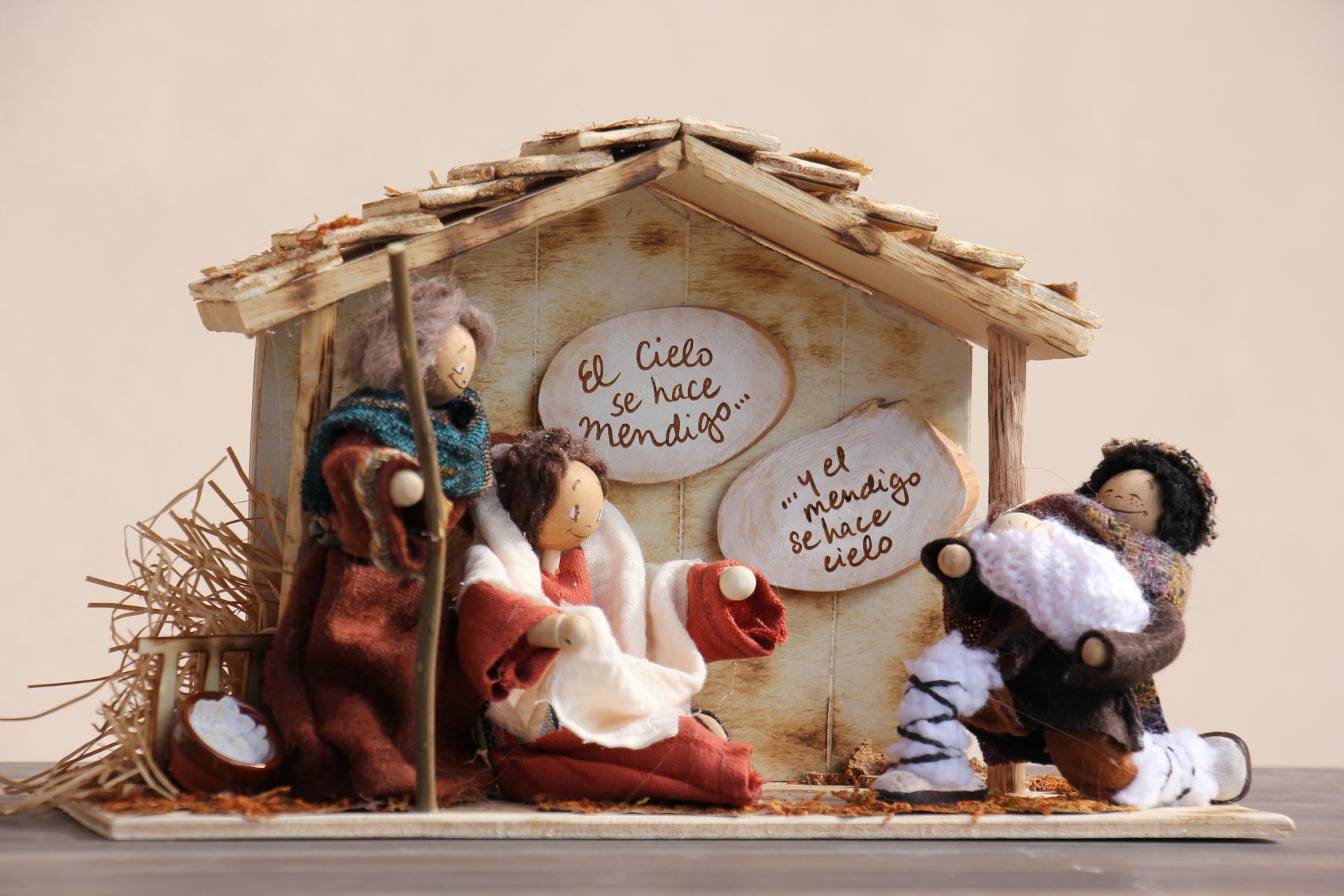 Entrañable portal de Belén con detalles de miniaturas trabajadas y pintadas a mano. Grabado en madera el mensaje: 'El cielo se hace mendigo... el mendigo se hace Cielo'.