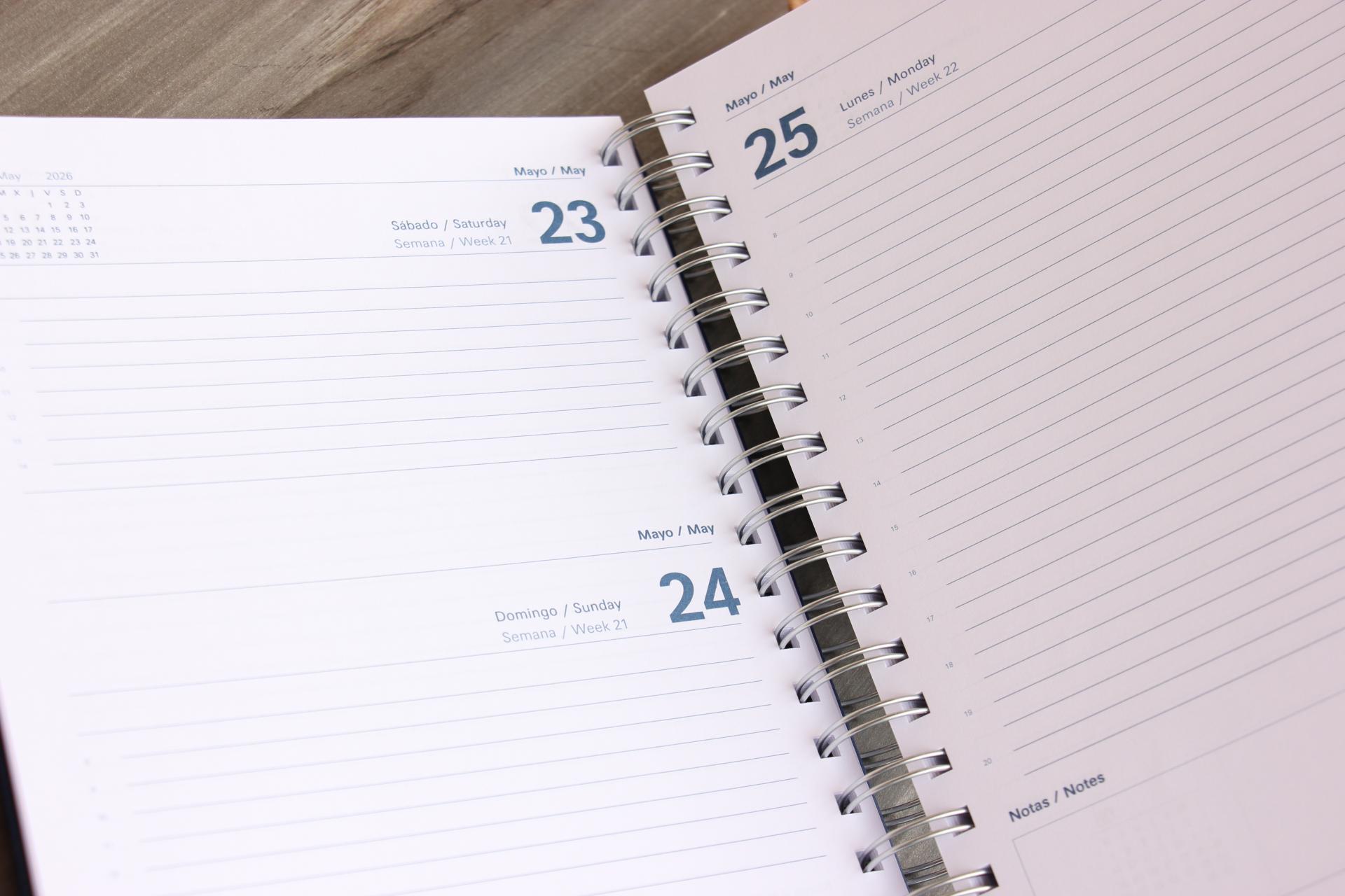 Agenda del año 2026 grabada con la imagen de la brújula y el mensaje "Que tu Espíritu Santo inspire nuestros pensamientos, palabras y acciones en este día".