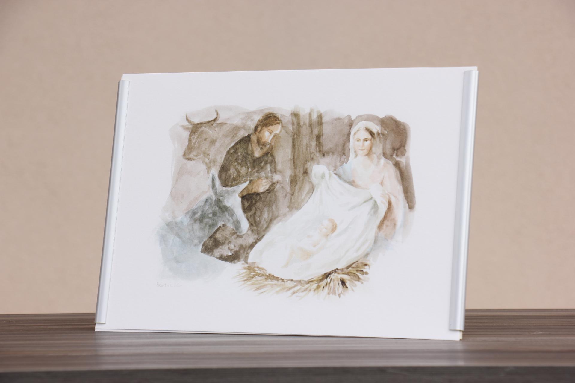 Reproducción de una acuarela con la imagen del Nacimiento pintada por una hermana de Iesu Communio.