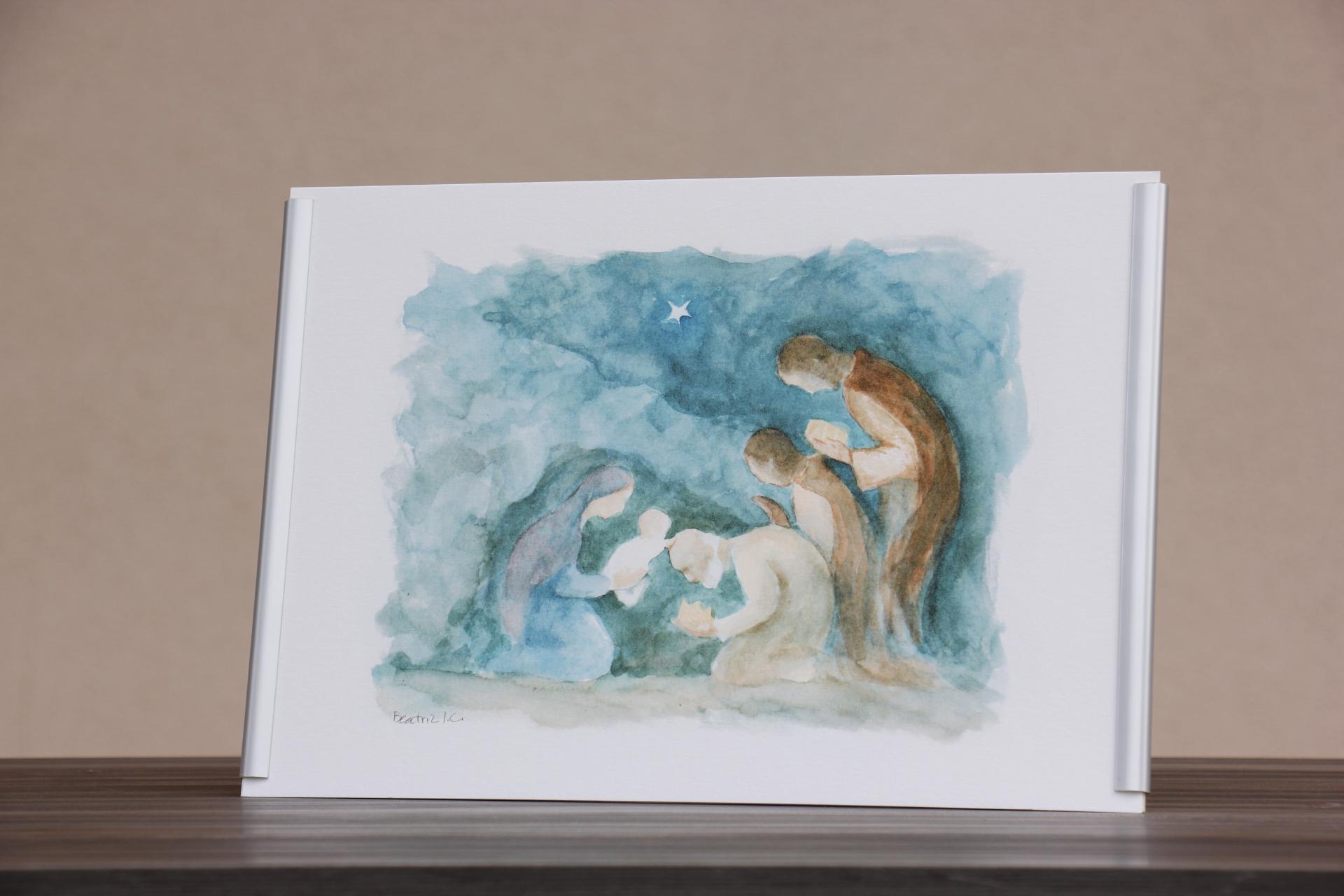 Reproducción de una acuarela con la imagen de la adoración de los Magos pintada por una hermana de Iesu Communio.