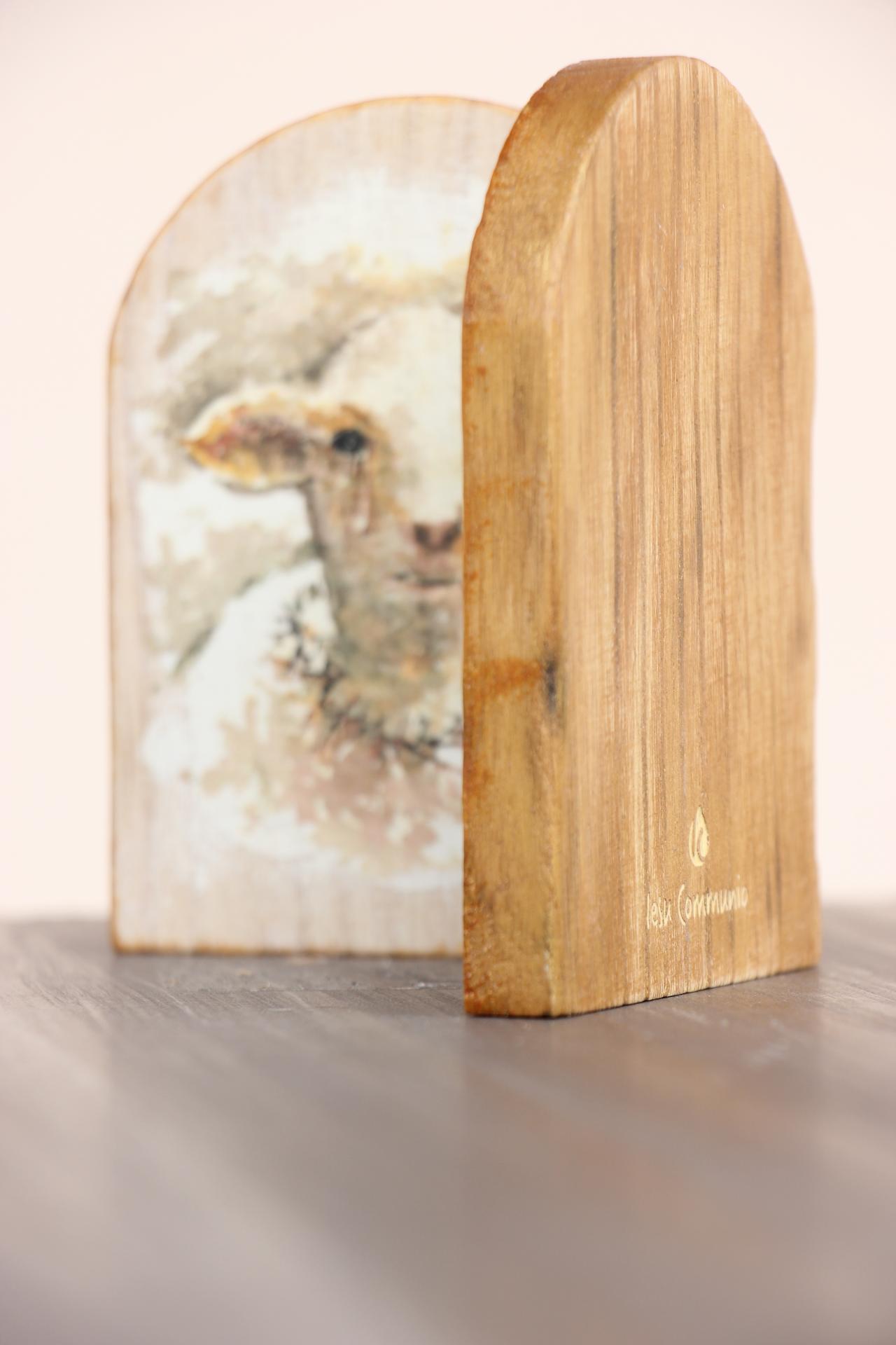 Reproducción de la imagen de Jesús, el Cordero inmolado, pintada por una hermana de Iesu Communio, sobre un díptico de madera natural.